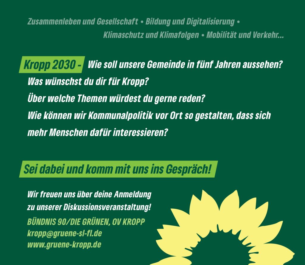 Mit der „Bürgerwerkstatt Kropp“ laden wir erstmalig alle interessierten Bürgerinnen und Bürger Kropps herzlich ein, miteinander und mit uns, dem Ortsverband Kropp von Bündnis 90/ Die Grünen, ins Gespräch zu kommen. Uns geht es darum zuzuhören, Perspektiven kennenzulernen und Ideen für die Zukunft unserer Gemeinde Kropp zu sammeln – jenseits von Tagesordnungen, Redezeiten und klassischen Sitzungsformaten.