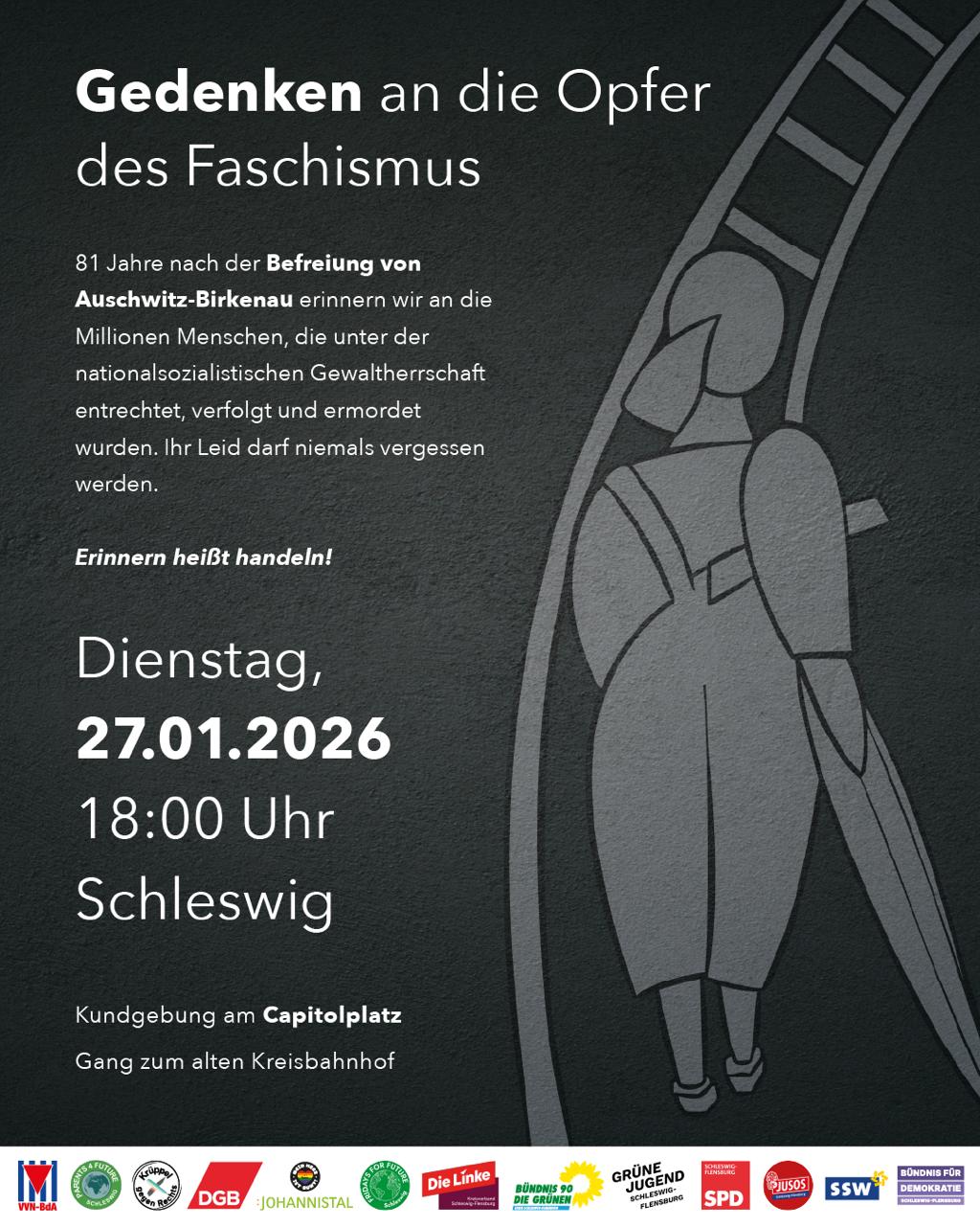 Um 18:00 Uhr beginnt eine öffentliche Gedenkveranstaltung auf dem Capitolplatz in Schleswig. Anschließend gehen die Teilnehmenden gemeinsam zum Alten Kreisbahnhof. Der Alte Kreisbahnhof ist ein historischer Tatort. Von hier aus wurden während der NS-Zeit 705 Menschen mit Behinderungen deportiert. Viele von ihnen wurden später ermordet. An diesem Ort soll ein sichtbares Zeichen des Erinnerns gesetzt werden. Getragen wird die Veranstaltung von einem breiten Bündnis.