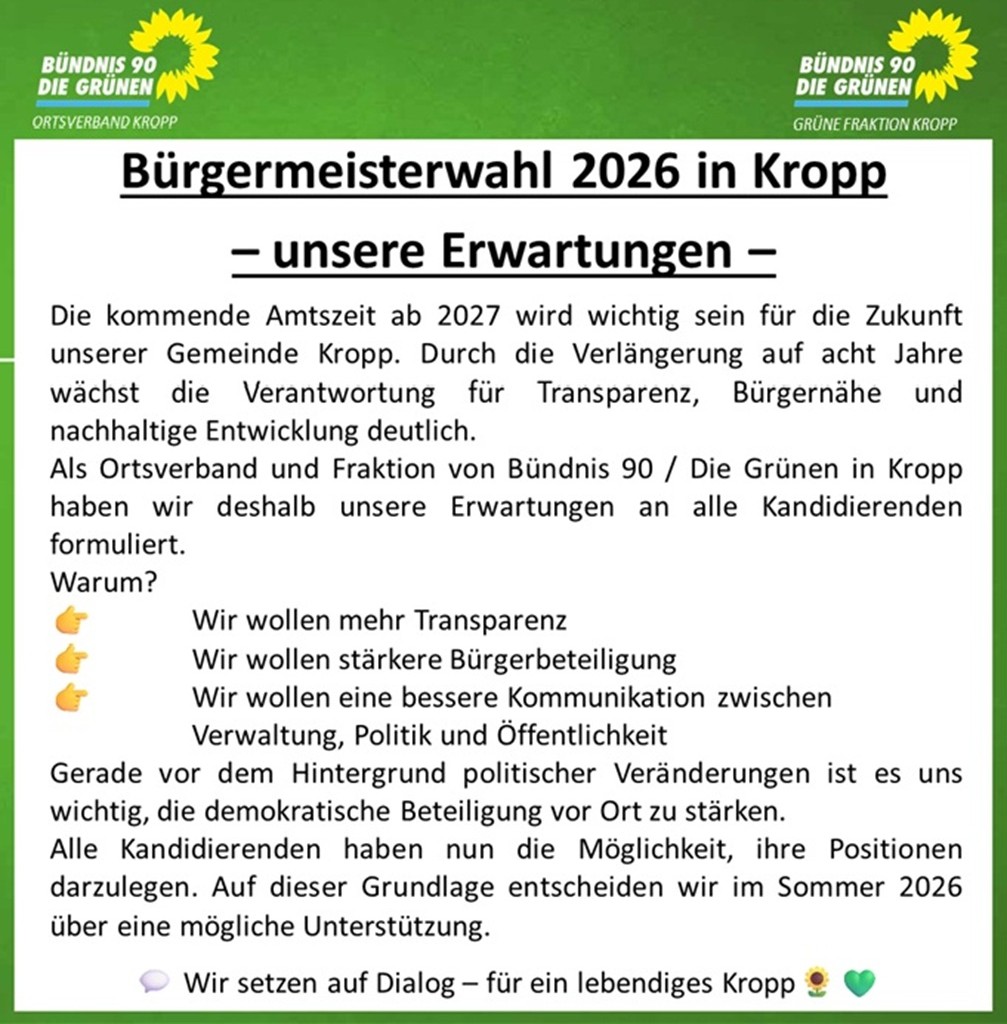 Im Vorfeld der Bürgermeisterwahl im September 2026 haben wir als Kropper Grüne unsere zentralen Erwartungen an alle Kandidierenden formuliert. Ziel ist es, Transparenz zu schaffen und frühzeitig einen inhaltlichen Dialog zu ermöglichen.